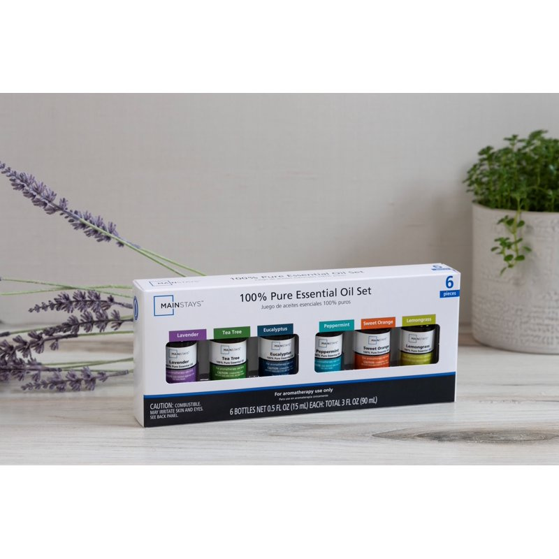 Maximize the benefits of six different lab-tested, all-natural and 100% pure essential oils. This set includes Eucalyptus, Lavender, Lemongrass, Sweet Orange, Peppermint, and Tea Tree oil. Each oil is unique and formulated to be used in a diffuser of your choice. With no artificial fragrances, enjoy the natural benefits of aromatherapy and therapeutic grade oils. Sourced from farmers around the world, distilled, and fresh botanicals brought to you in a bottle.* all-natural Essential Oils are free of harsh chemicals, certified 100% pure, lab tested, and formulated to be therapeutic grade.* Sourced from farmers around the world, distilled, and fresh botanicals brought to you in a bottle.* Start a solid aromatherapy foundation with these everyday essential oil basics. Each has been selected for its vibrant fragrance and aromatherapy properties.* Use as individual oils or blend together for a variety of benefits.* This set of six includes invigorating Eucalyptus, calming Lavender, energizing Lemongrass, joyful Sweet Orange, Peppermint, and purifying Tea Tree essential oils.