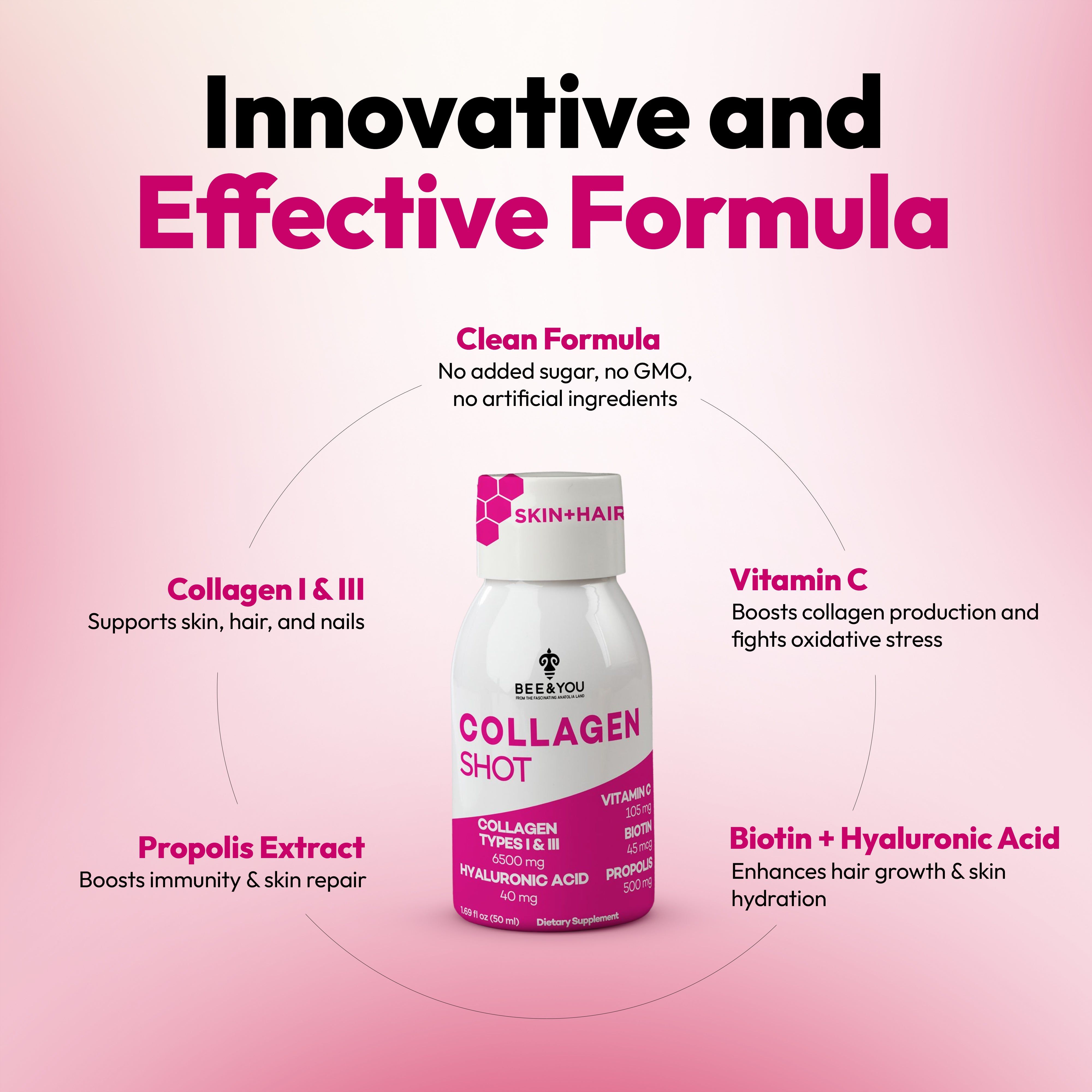 Support your beauty naturally with a great tasting BEE&YOU liquid collagen shot! Formulated with Hydrolyzed bovine collagen (Types I & III), Vitamin C, Hyaluronic Acid, Biotin, Pomegranate juice, strawberry juice, cinnamon, Anatolian propolis extract and honey. Collagen Skin + Hair + Nail + Support*