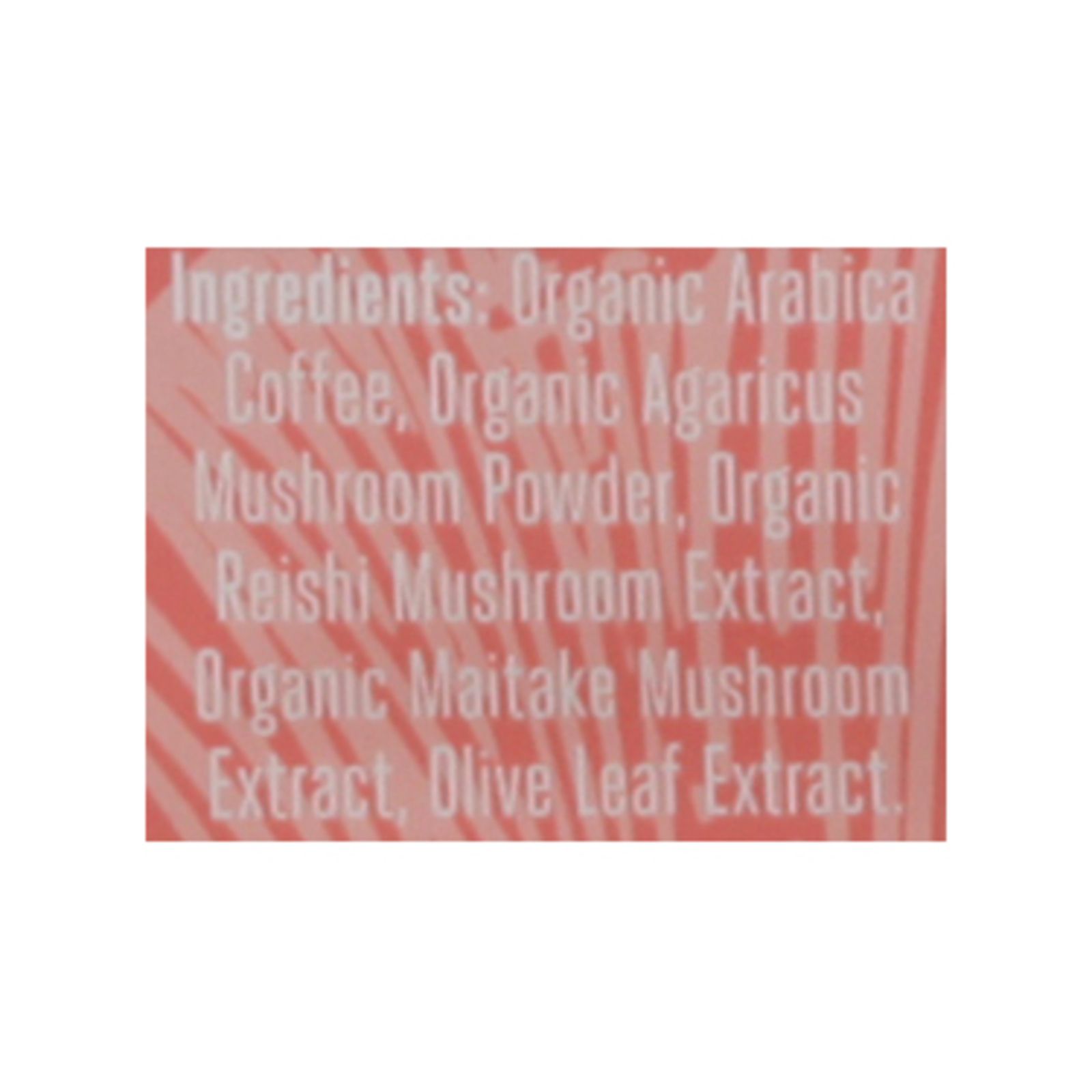 ingredients : organic arabica coffee;organic agaricus mushroom powder;organic reishi mushroom extract;organic maitake mushroom extract;olive leaf extract
