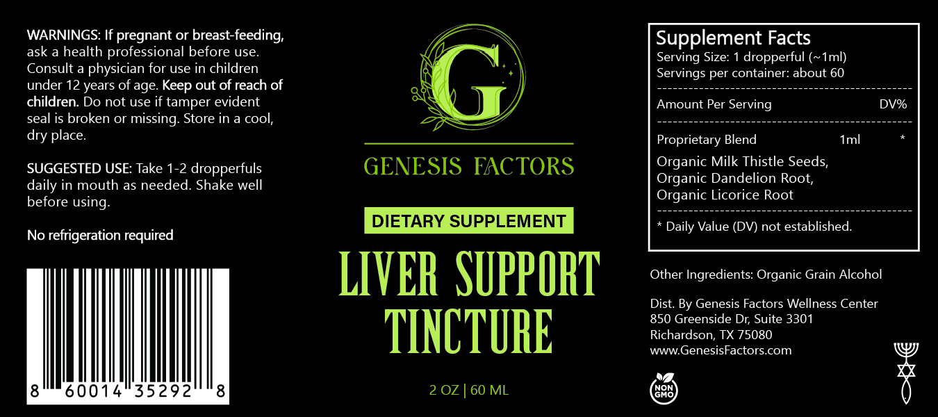 1.Genesis Factors Liver Support Tincture is a natural, organic solution designed to support and promote liver health. Its carefully selected ingredients work synergistically to detoxify, repair, and rejuvenate the liver.