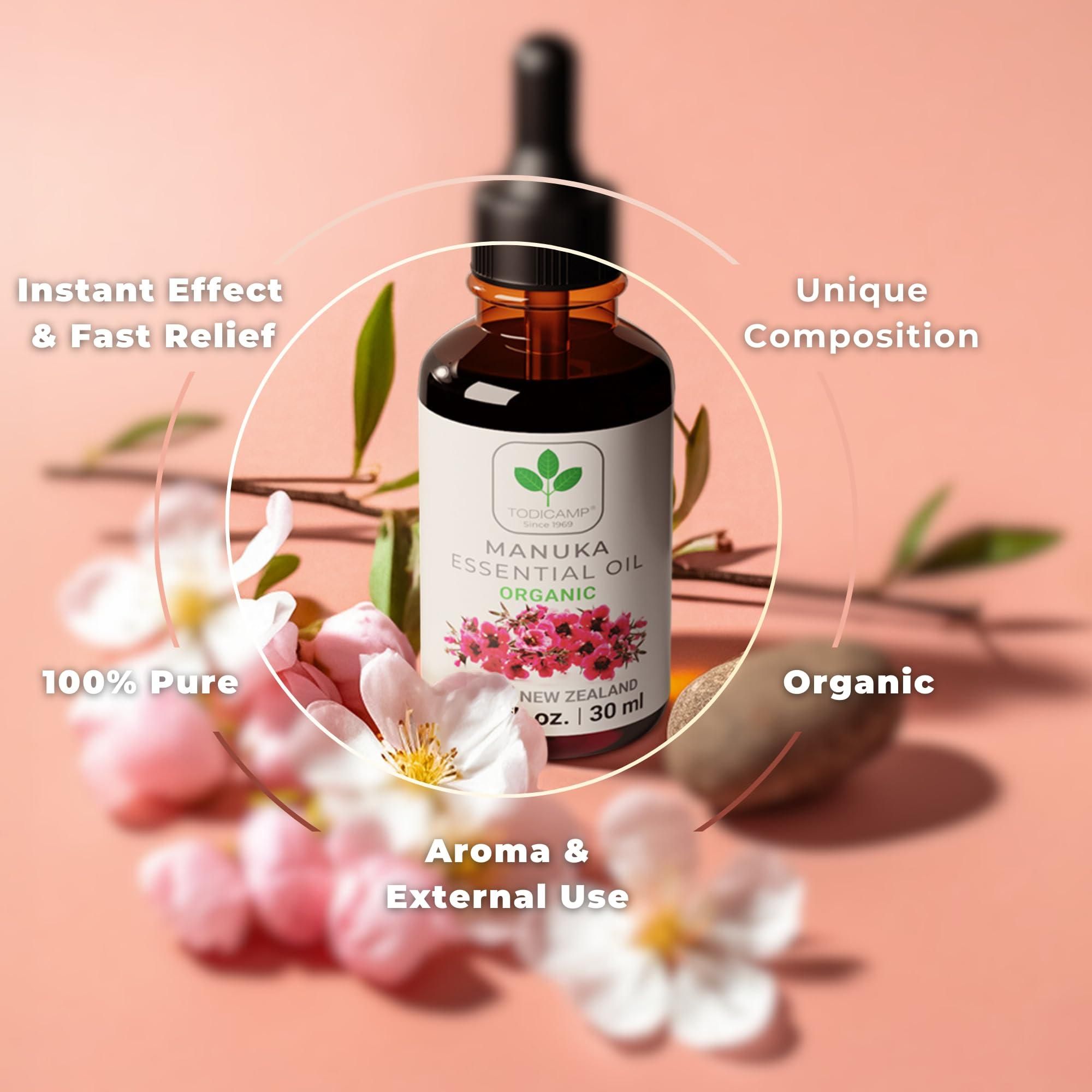 1.pure manuka oil: todicamp manuka oil is sourced from the indigenous manuka tree, widely known for its manuka honey oil and named new zealand's miracle. our organic manuka essential oil, steam-distilled, is studied to be up to 25 times stronger than regular tea tree oil. manuka oil for skin: its natural revitalizing properties promote skin health, making it ideal for addressing various skin concerns. the soothing effects of manuka essential oil help calm irritated skin, aid in natural