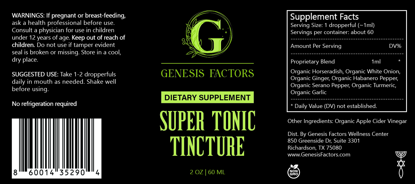 Revitalize your health with Genesis Factors Organic Super Tonic Tincture, a potent blend of nature's finest ingredients.