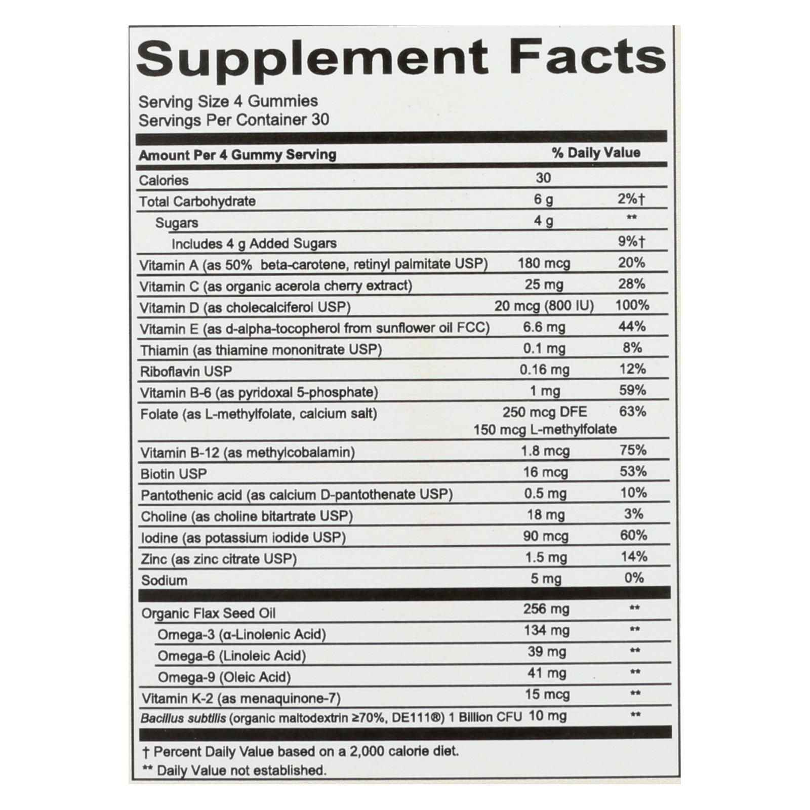 ingredients : vegetarian omega 3s probiotic* bacillus subtilis vitamin d as d3 folate as methylfolate vitamin b12 as methylcobalamin vitamin k as k2 choline zinc