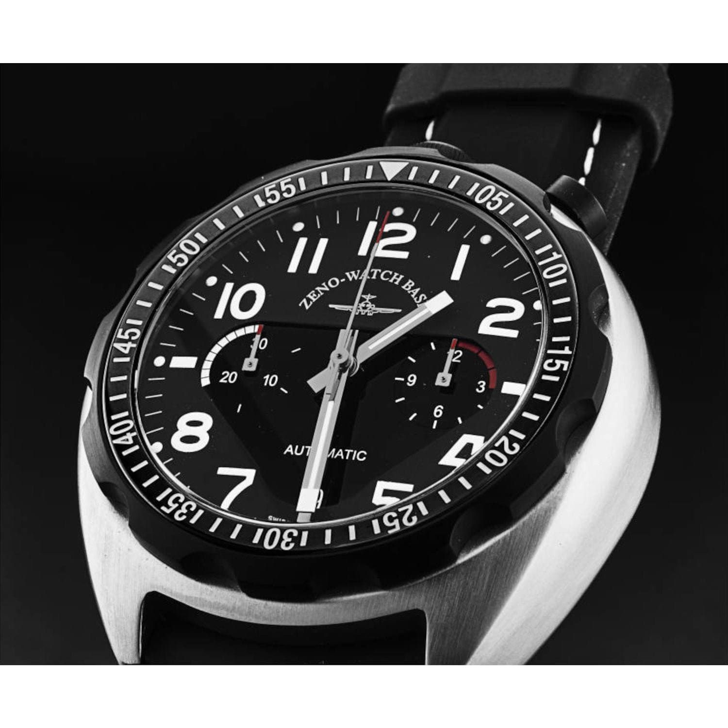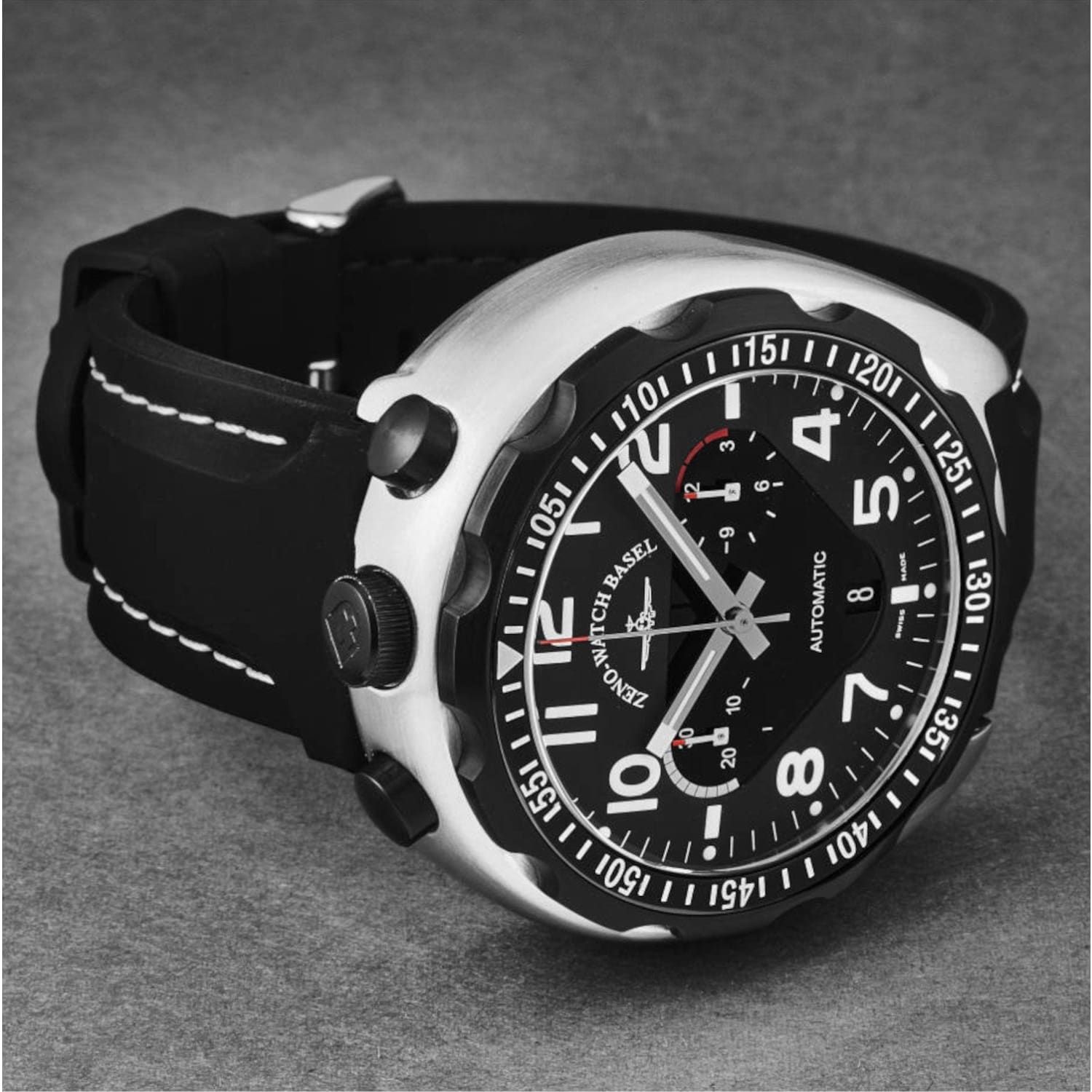 Zeno 6528-THD-A1 Men's 'Pilot Bullhead' Chrono Limited Edition Black Dial Black/White Rubber Strap Automatic Watch features a stainless steel 47mm case; with a fixed bezel; a black dial and a scratch resistant sapphire crystal. The 22mm leather band is fitted with a tang clasp. This beautiful wristwatch; powered by Swiss automatic movement. This watch has a water resistance of up to 1000 feet/300 meters; suitable for recreational swimming; not for diving and snorkeling.
