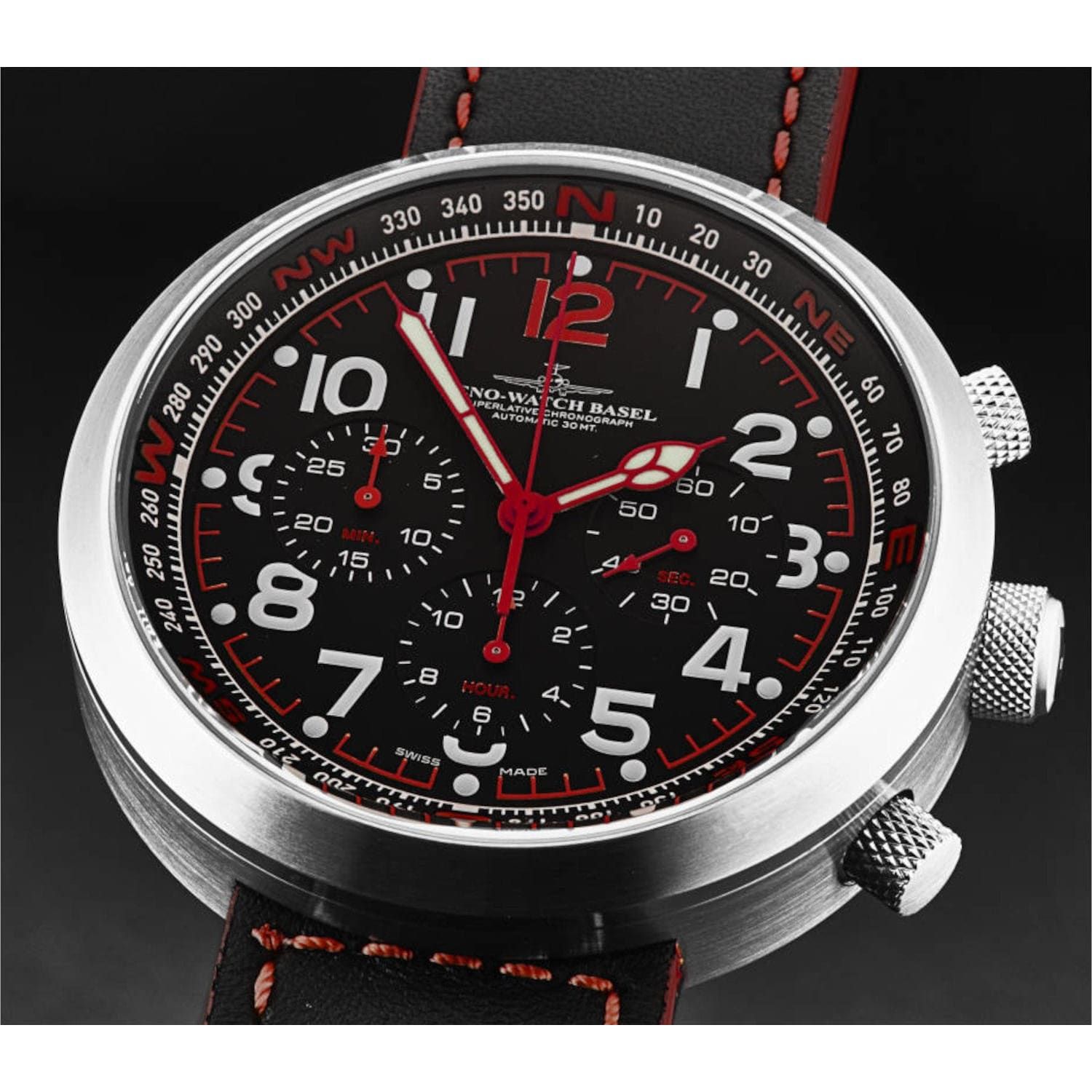 Zeno B560-A17 Men's 'Rondo' Chronograph Black Dial Black/Red Leather Strap Automatic Watch features a stainless steel 45mm case; with a fixed bezel; a black dial and a scratch resistant mineral crystal. The 22mm leather band is fitted with a tang clasp. This beautiful wristwatch; powered by Swiss automatic movement. This watch has a water resistance of up to 1000 feet/300 meters; suitable for recreational swimming; not for diving and snorkeling.